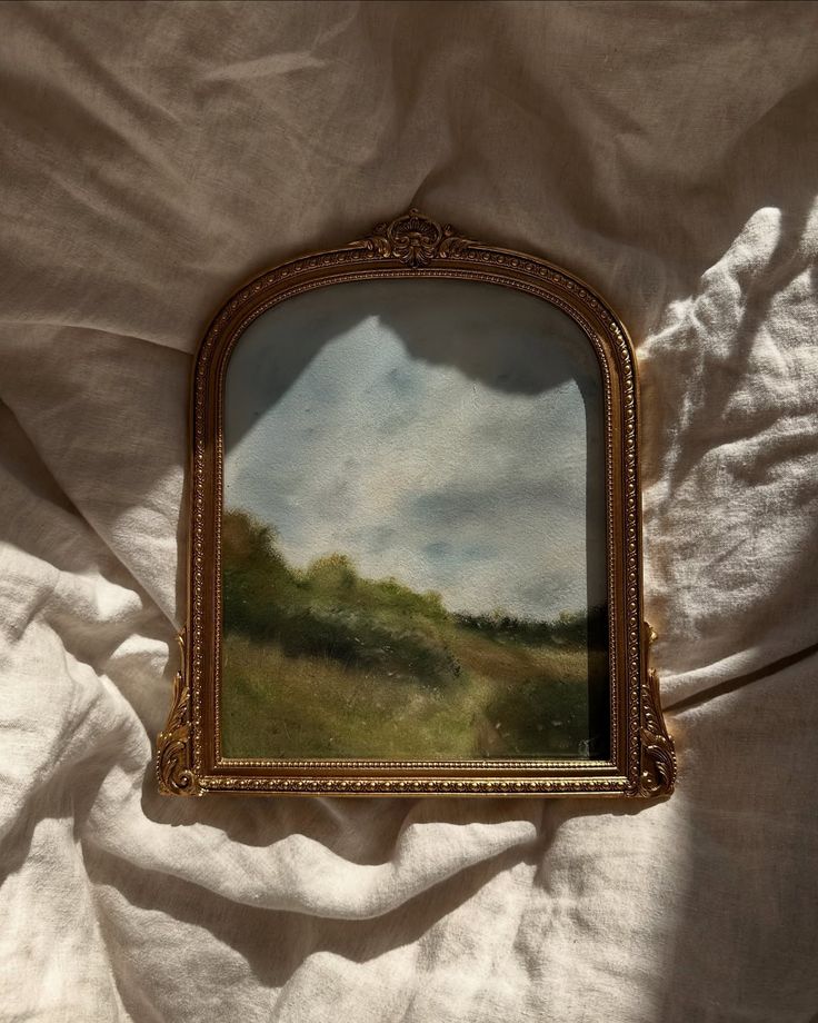 Green Meadow set with a mysterious pathway and a clouded sky on an arched gold frame.