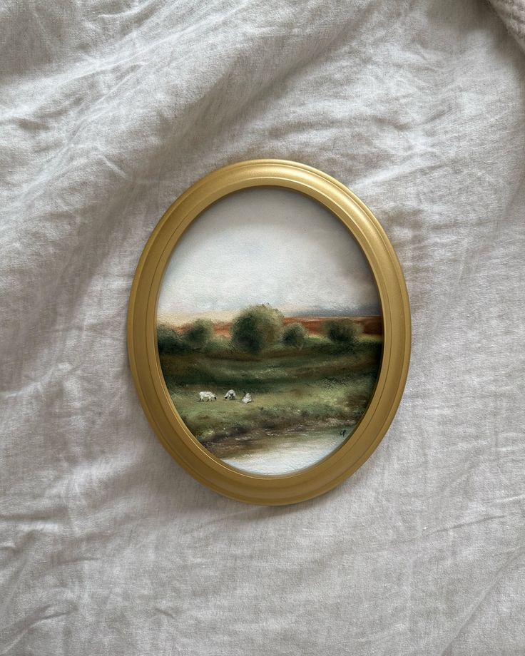 A gentle countryside moment captured in Sheep in Peace, this 8"x10" original rests within a beautifully detailed gold oval frame. Soft hills, quiet sheep, and a sense of pastoral calm fill this piece with warmth and serenity, now gracing its forever home with a touch of rustic charm and peaceful simplicity.